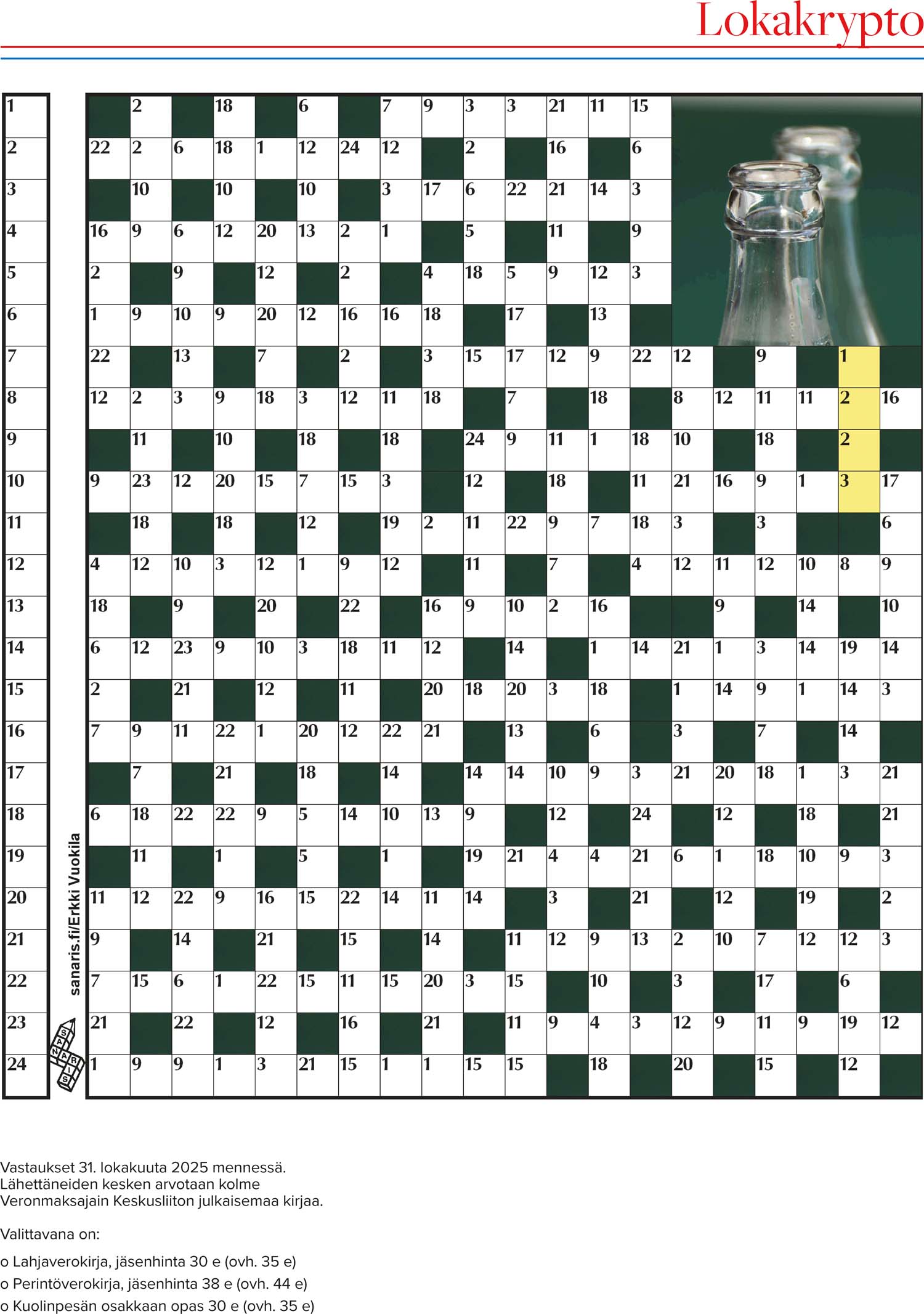 Taloustaito 9/25Tyyppi: kryptoVaikeustaso: helppo/kesk. Laatija: Erkki Vuokila Piirtäjä: Erkki Vuokila |